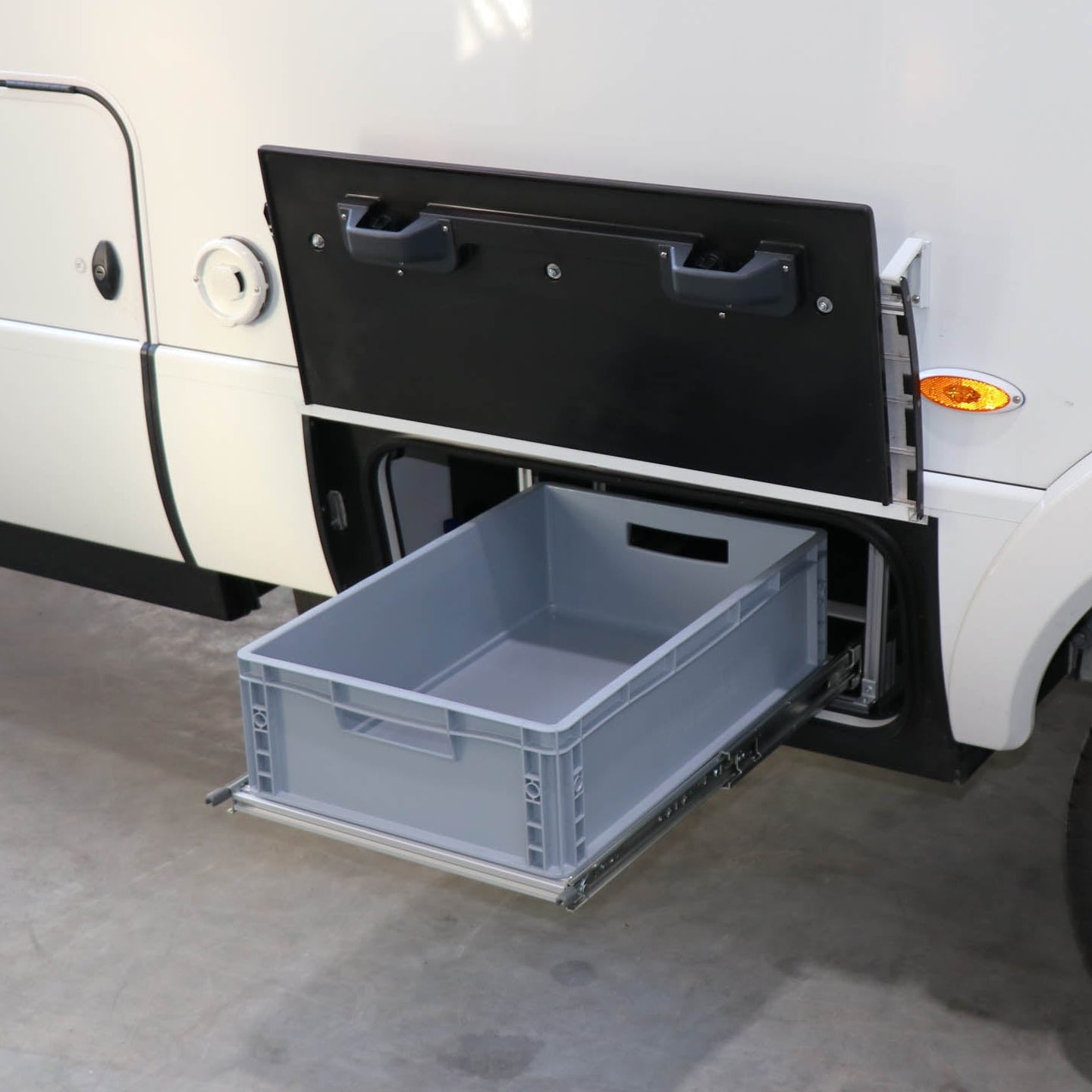 Passgenaues Auszugsregal aus Aluminium für die Heckgarage des Hymer B 780. Das Regal wird auf der rechten Seite zum Wohnraum hin montiert und bietet auf vier Ebenen Platz für Euroboxen. Die oberen drei Etagen sind voll ausziehbar und ermöglichen schnellen Zugriff von außen, ohne in die Garage zu steigen.